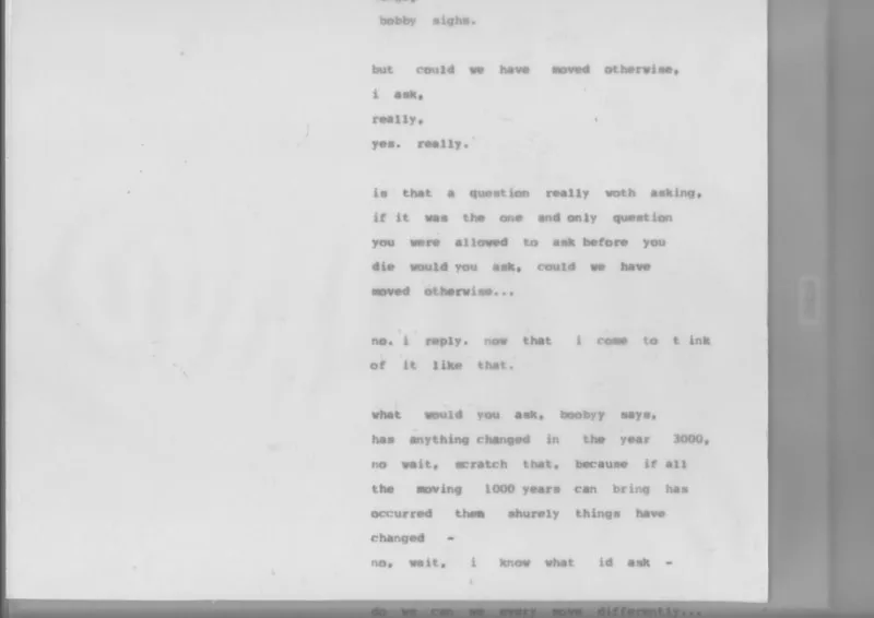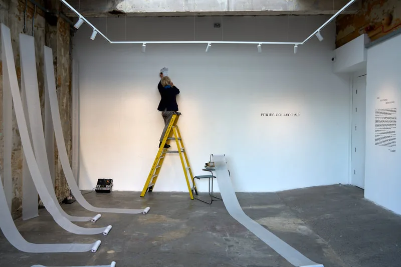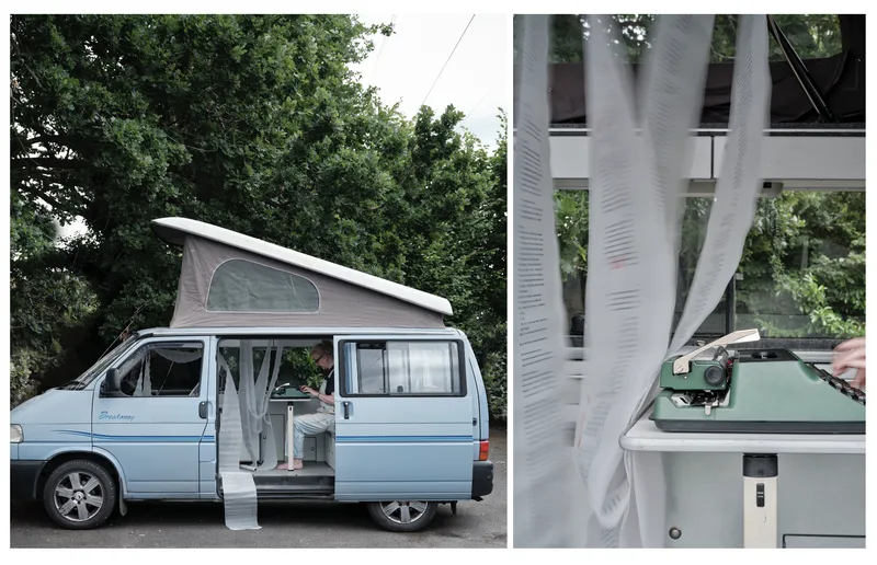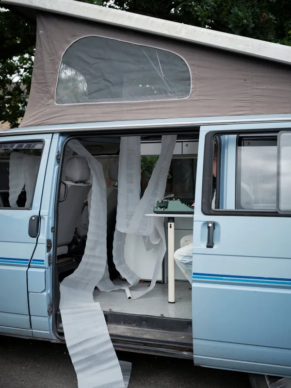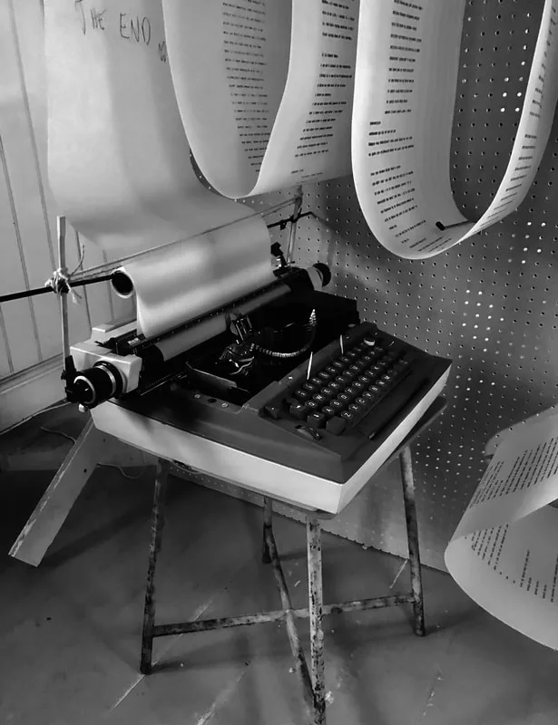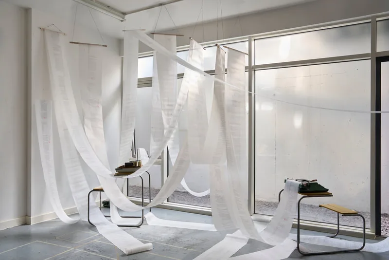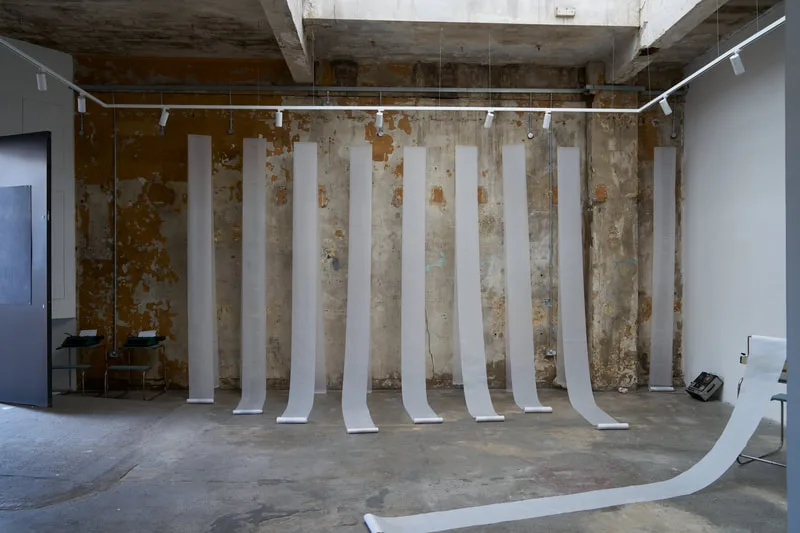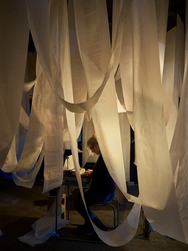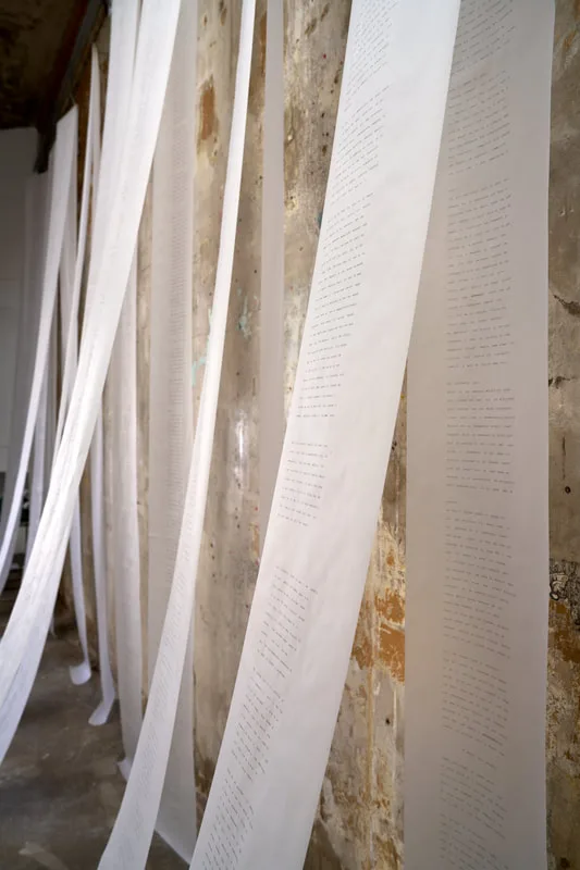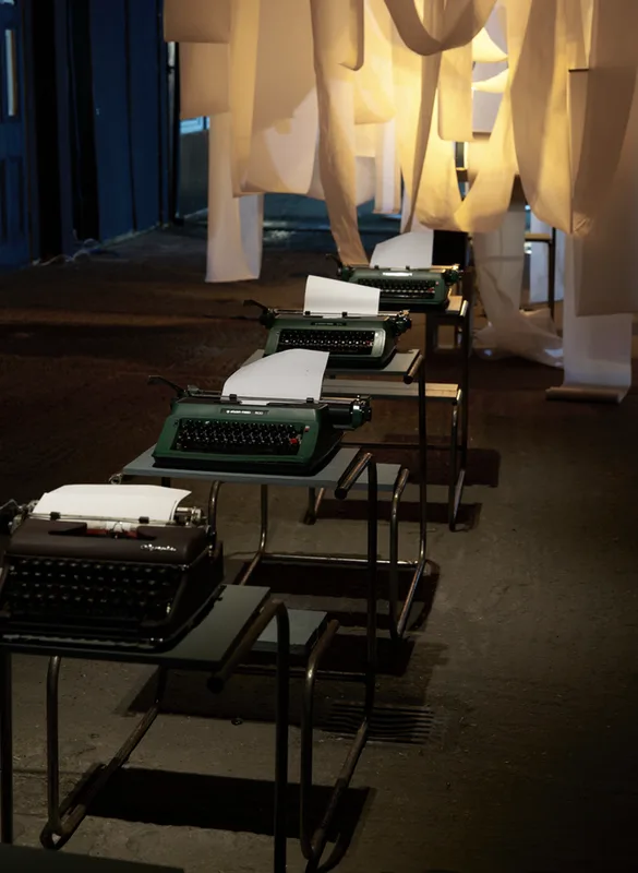 Predictive Text 01.01.3000 is a trance-writing installation of ten 20-metre scrolls suspended as analogue thought-clouds. Written on vintage typewriters and based on the astrological chart of the Third Millennium, the work channels a stream of consciousness that echoes mystic texts and Beat poetics, treating prediction as imagination and courage.