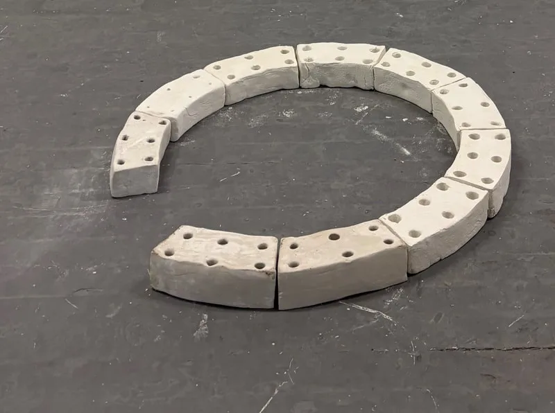 Porcelain lies is the heart of my practice: a vision of sculpture not as static object, but as vessels for resonance, breath, and transformation. Using studio and my own MW porcelain, one of the most luminous and fragile clays, and slip moulds, my projects create brick built acoustic chambers, curves, and resonant vessels that explore harmonics as collective experience. These forms are activated through mantra, overtone chanting, and Kundalini yoga and meditation, opening spaces for stillness, listening, and shared vibration. The foundations laid, I'm now creating curved porcelain bricks.