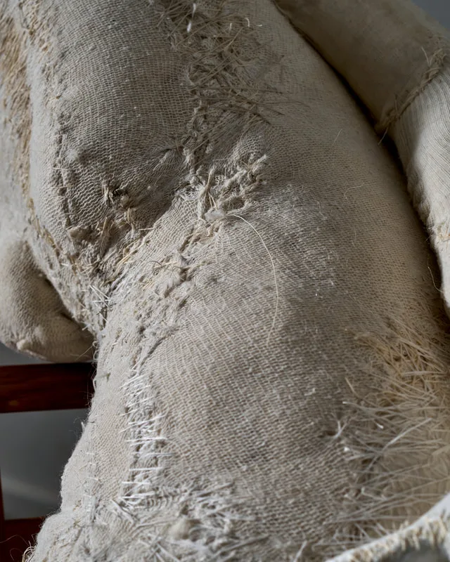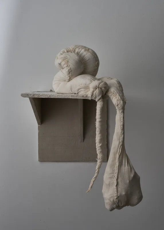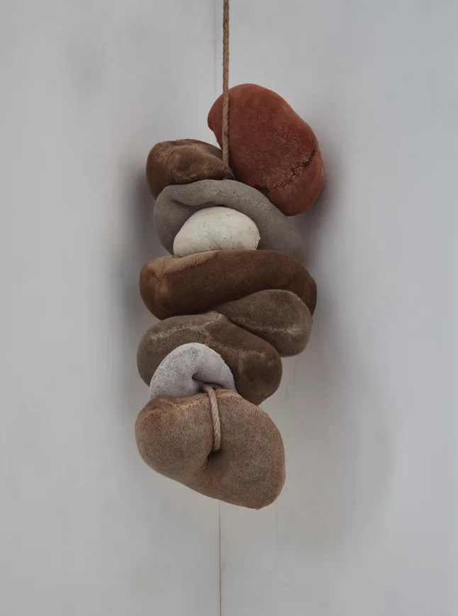 The shifting buckwheat hulls, the tensile seams, and the porous surfaces of distemper and marble dust create a gentle flexion within the sculpture. Each form becomes a soft register of pressure, revealing the intimate negotiations between gravity, tension and breath. These slight movements and weight transfers speak to the unspoken burdens carried across emotional, environmental, social and esoteric realms that shape the body and its relations.