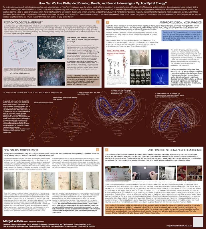 Published on Academia.edu, PhilPapers, Researchgate. Presentations given at TSC Poster Presentation, Towards a Science of Consciousness, Helsinki (2015), Breath Induced ‘Vivid Dreaming’ (BIVD:) Soma-Neuro-Immersive (SNI) Breath Work for Release of Soma-Neuro Holding Patterns, RCPSYCH Poster Presentation: Royal College of Psychiatry International Congress, Edinburgh (2017), How Can We Use Bi-Handed Drawing, Breath, and Sound to Investigate Cyclical Spiral Energy? Science of Consciousness, Taormina, Italy (2023).