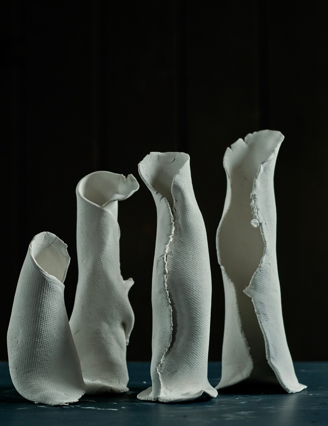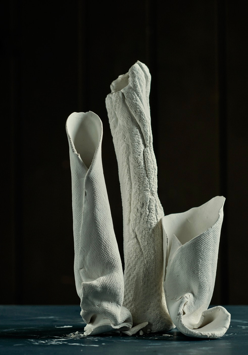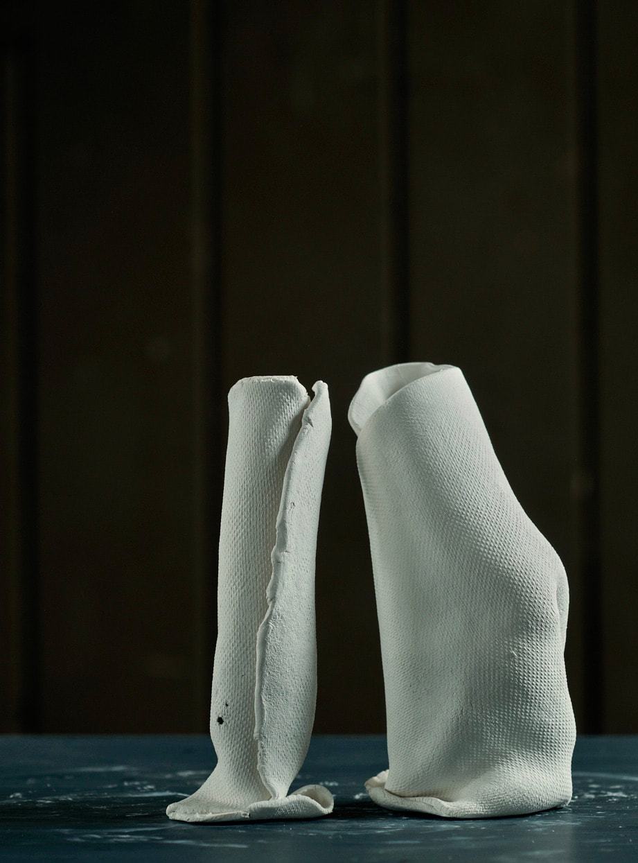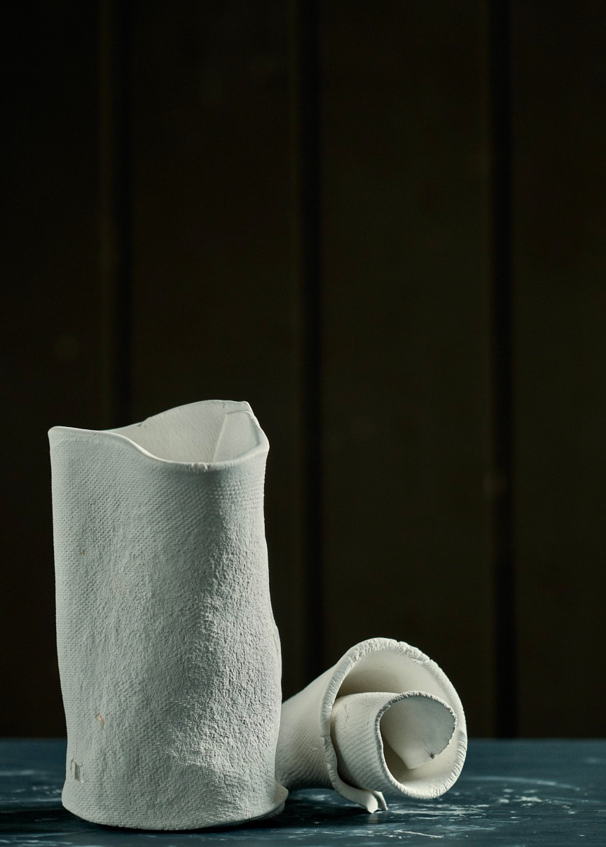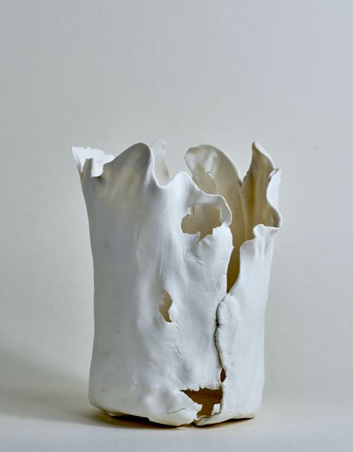 These pieces are rolled Royal Porcelain, thrown by hand then suspended in water. The technique is experimental and I am interested in the exploring the limitation of the form in terms of gravity and erosion.