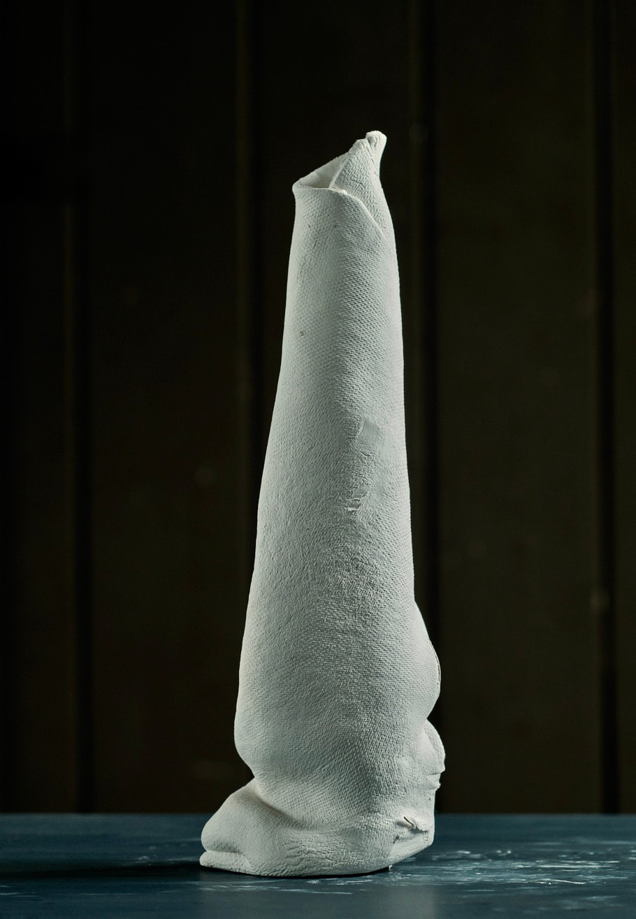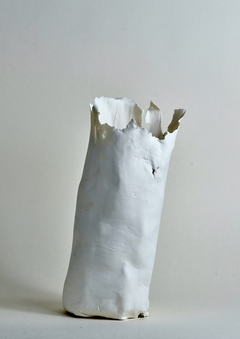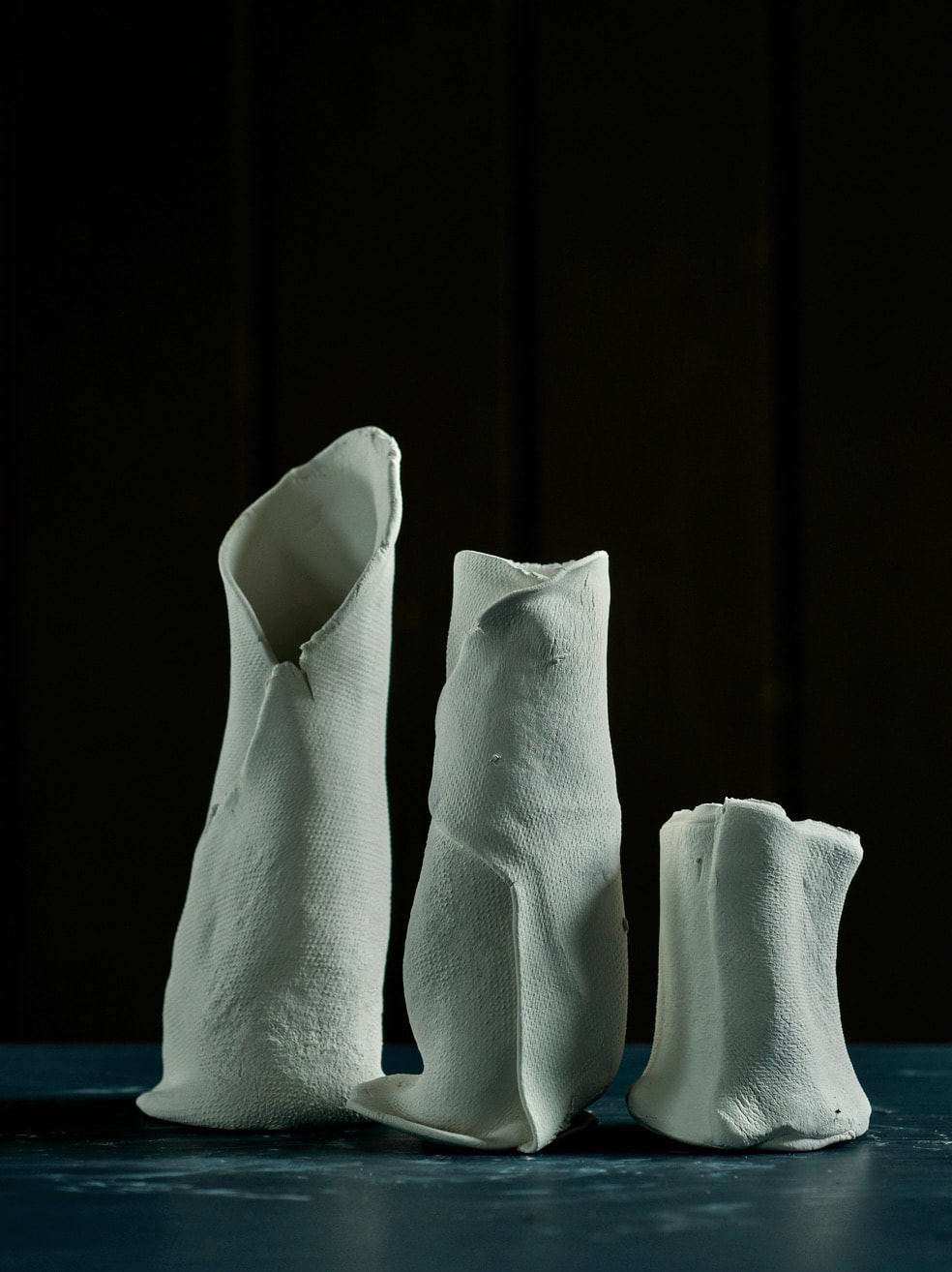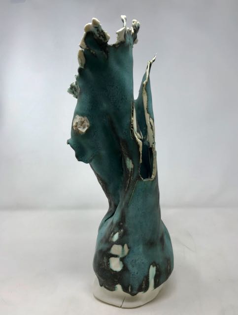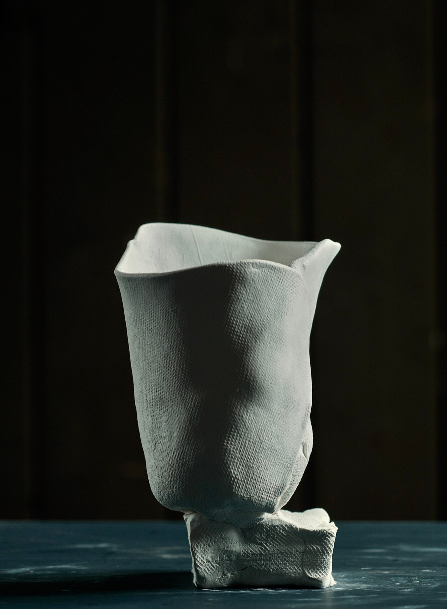 These pieces are rolled Royal Porcelain, thrown by hand then suspended in water. The technique is experimental and I am interested in the exploring the limitation of the form in terms of gravity and erosion.