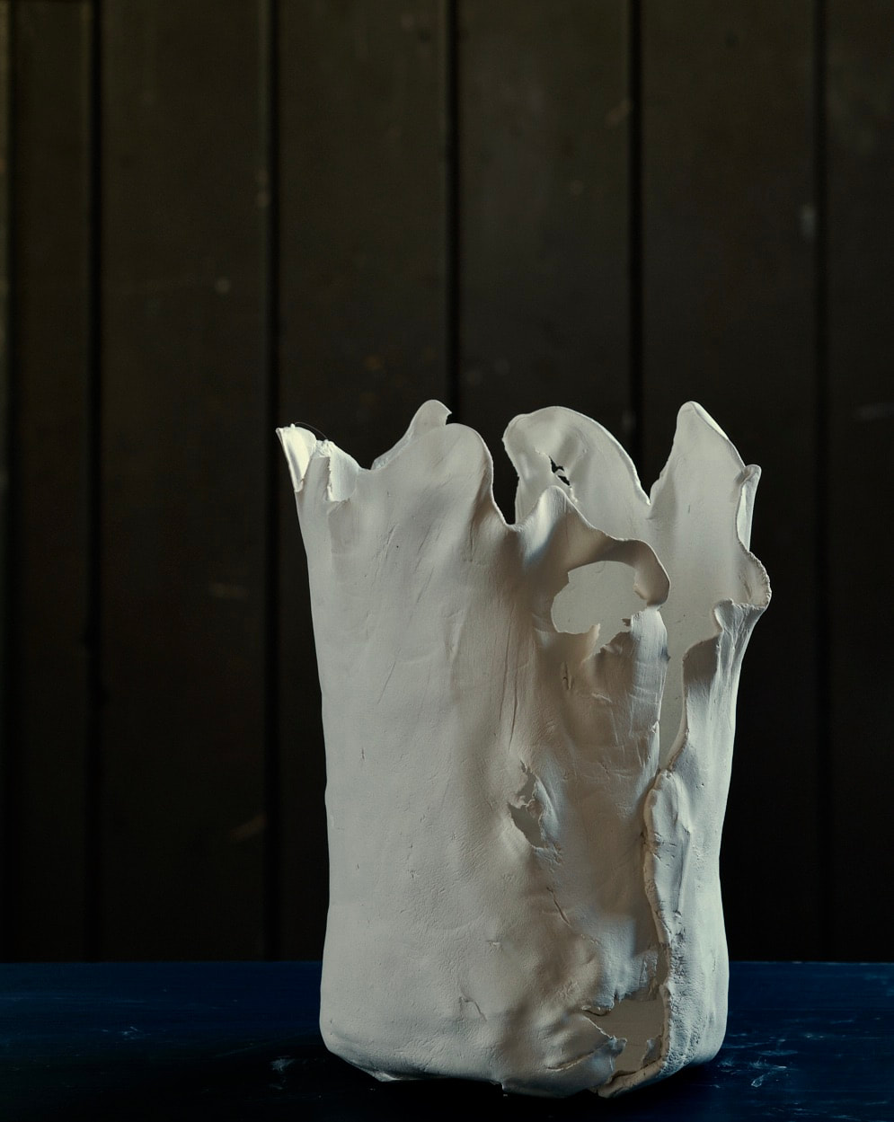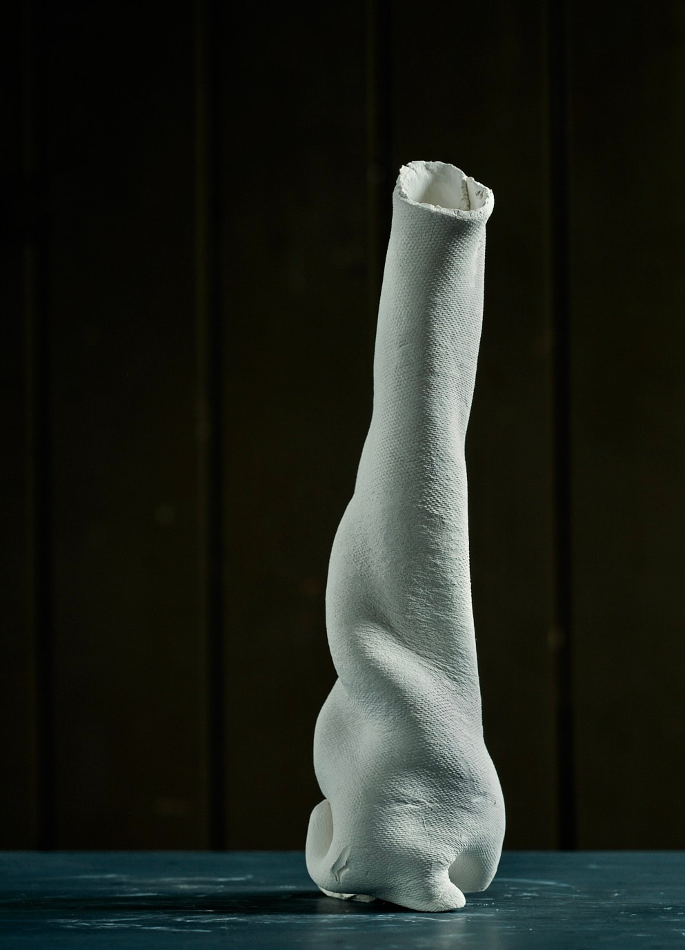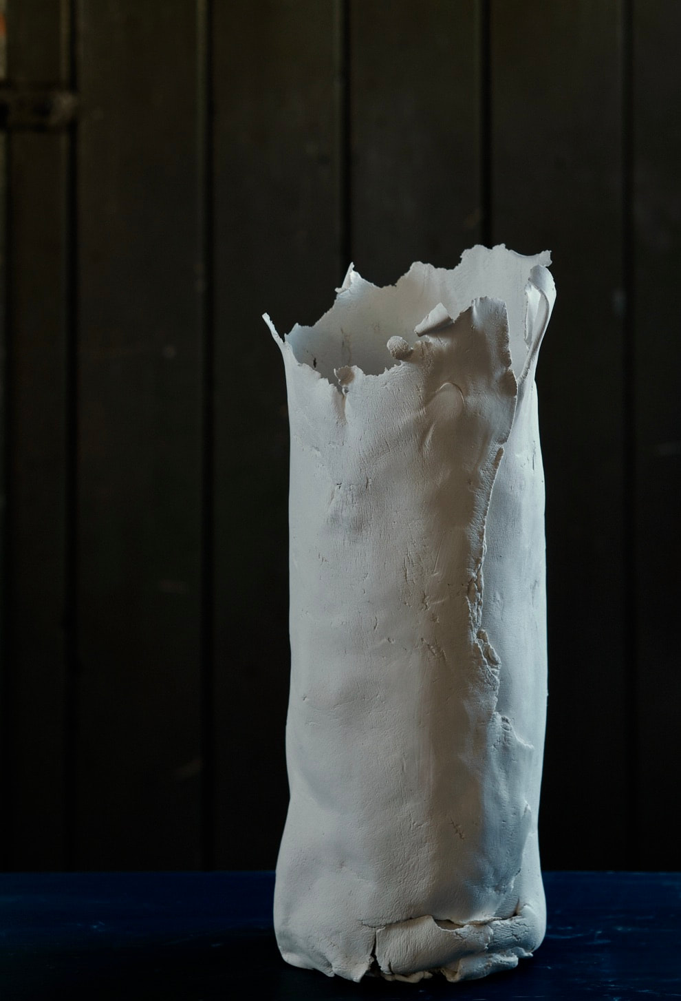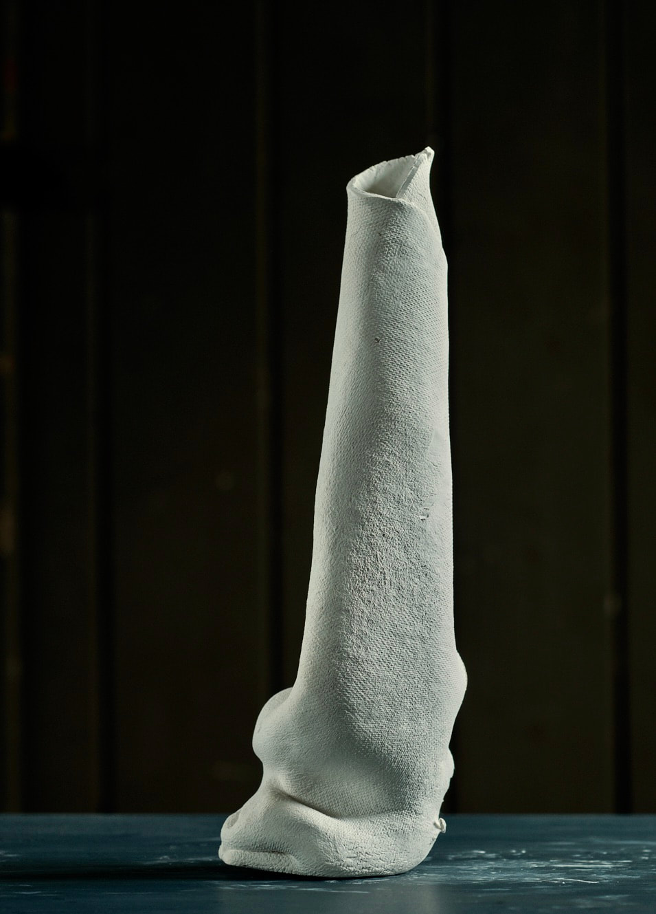 These pieces are rolled Royal Porcelain, thrown by hand then suspended in water. The technique is experimental and I am interested in the exploring the limitation of the form in terms of gravity and erosion.
